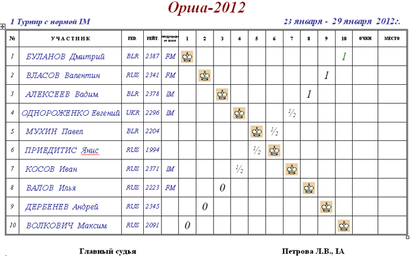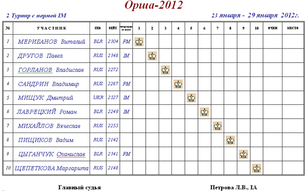 1-11 ЛУНЕВ, Андрей RUS 2500 69 1 1.0 0.00 2.0 КЛИМЕНОК, Михаил BLR 2300 37 1 1.0 0.00 2.0 СУЛЕЙМАНЯНЦ, Одиссей RUS 2300 70 1 1.0 0.00 2.0 ЛОСЕВ, Владимир BLR 2000 36 1 1.0 0.00 2.0 МАЖЕЙКО, Игорь BLR 2000 59 1 1.0 0.00 2.0 ПАРФЕНОВ, Виктор BLR 2000 77 1 1.0 0.00 2.0 САКСОНОВ, Леонид BLR 2000 61 1 1.0 0.00 2.0 СТЕПНОВ, Игорь BLR 2000 79 1 1.0 0.00 2.0 ЦЫГАНКОВ, Игорь RUS 2000 62 1 1.0 0.00 2.0 ХАРКЕВИЧ, Павел BLR 1600 74 1 1.0 0.00 2.0 КОРЫТКО, Антон BLR 1800 98 1 0.5 0.00 2.012-15 КАТАШУК, Владислав BLR 2300 75 0.5 1.5 0.25 1.0 ПОНИКАРОВСКИЙ, Алексей RUS 2300 72 0.5 1.0 0.25 1.0 ГРИГОРЬЕВА, Светлана RUS 1800 92 0.5 1.0 0.25 1.0 ЕВДОКИМОВА, Екатерина BLR 1800 95 0.5 0.5 0.25 1.016-26 ВРКОЧ, Людмила RUS 2000 47 0 1.5 0.00 0.0 АРХИПЕНКО, Александр BLR 1800 90 0 1.0 0.00 0.0 АСТАПЕНКО, Иван BLR 1800 74 0 1.0 0.00 0.0 ГРИНЕВСКИЙ, Вячеслав BLR 1800 72 0 1.0 0.00 0.0 ЖУКОВ, Владимир BLR 1800 57 0 1.0 0.00 0.0 МОСКВИЧ, Валерий BLR 1800 59 0 1.0 0.00 0.0 СЕЛЕНЧИК, Анастасия BLR 1800 99 0 1.0 0.00 0.0 ХРАПКО, Маргарита BLR 1800 98 0 1.0 0.00 0.0 ЧЕРЛЕНОК, Ричард BLR 1800 37 0 1.0 0.00 0.0